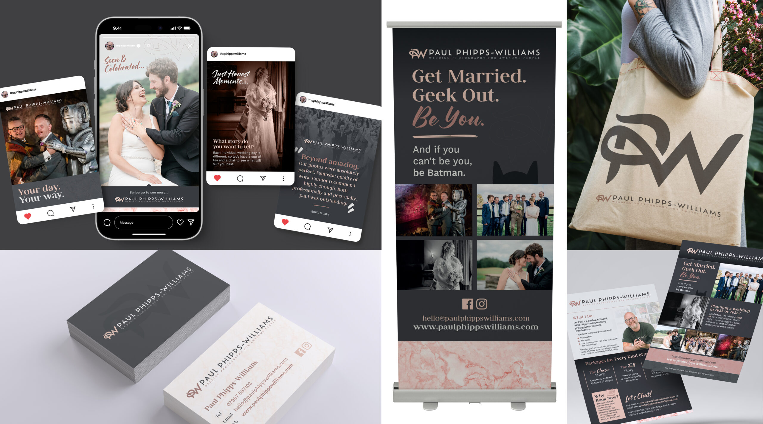 The early sessions revealed a clear tension that needed resolving. One of the core challenges was finding the right balance between Paul’s proudly geeky personality and the level of polish expected from a premium wedding photographer. His couples often share the same interests and respond to that openness, but he was very clear that he did not want a novelty brand. He wanted something that felt warm, approachable and unmistakably him without drifting into anything that might look tacky or themed. The solution was to keep the visuals elegant and restrained and let the personality come through in the tone of voice. This gave Paul space to express his humour and enthusiasm in a natural way, while the identity itself stayed clean, confident and firmly positioned in the luxury space.