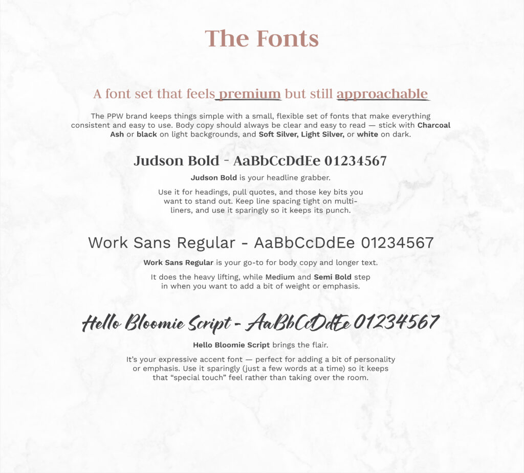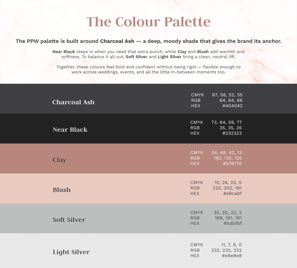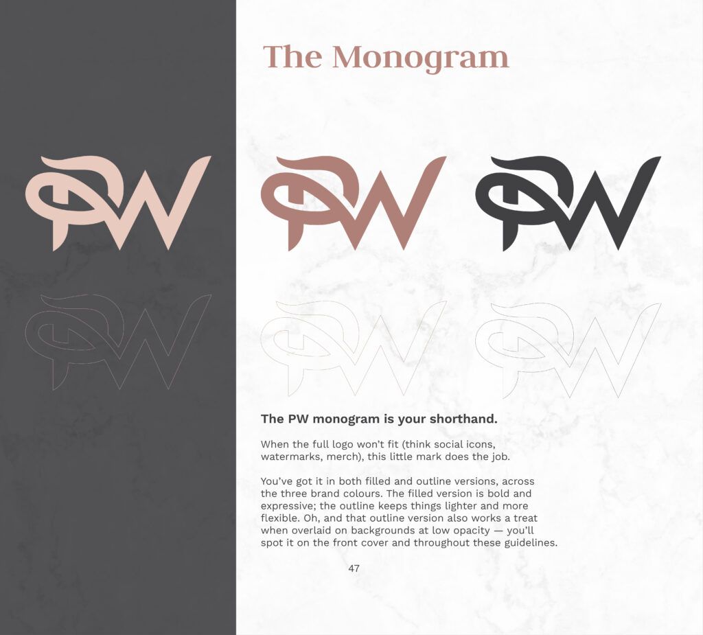 A bespoke PW monogram (with a sneaky extra “P” tucked inside) sits alongside a customised logotype. The monogram’s flowing lines add personality and creative flair, while the tagline Wedding Photography for Awesome People keeps things grounded, premium, but still welcoming.